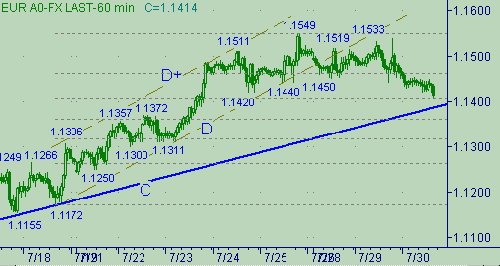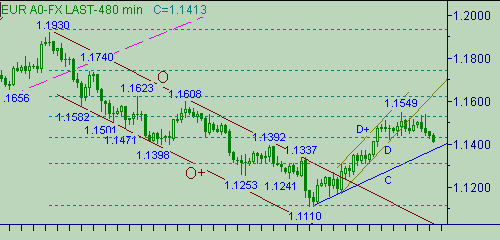 остается интервал 1.1400-1.1430. На рис. 2 и 3 видим, что совсем близко к этой области поднимается линия C. Текущее положение линии C на рис. 3 соответствует значению курса 1.1384. В случае опускания курса ниже 1.1400 интересы рынка переходят в диапазон 1.1310-1.1400.Сильным медвежьим сигналом считаем закрытие дня ниже 1.1325. В этом случае у рынка появляются технические предпосылки для повторного подхода к области 1.1110.