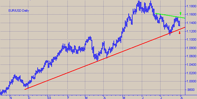 До тех пор пока евро/доллар находится в симметричном треугольнике, грани которого обозначены зеленой и красной линиями тренда, ничего определенного сказать нельзя. Любой прорыв (закрытие дня-двух дней) одной из этих линий вызовет усиление торговой активности. Рекомендуется пока оставаться вне рынка. При приближении последнего к красной линии рекомендуется лонг с жестким стопом под красной линией тренда.