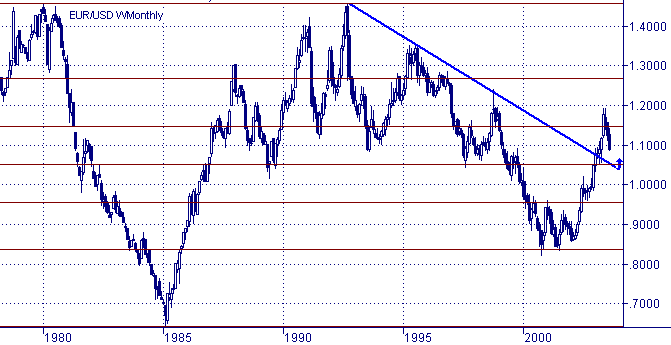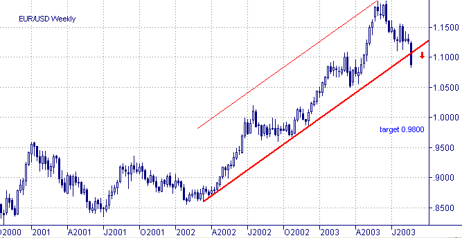 На минувшей неделе курс евро совершил самый глубокий нырок по отношению к доллару за последние два с половиной года, что позволяет назвать подобную девальвацию самым элементарным словом − "обвал". Помимо столь масштабных потерь - факт которых не вызывал ни у кого сомнения еще зимой и весной, потому что многие позитивные новости об экономике США остались тогда незамеченными − это падение повлекло за собой и ряд коренных технических последствий, главным из которых стоит признать изменение направленности трендового движения. Правда, пока мы можем утверждать это применительно к недельному графику, месячная свеча закроется через неделю. Итак, на недельном графики мы видим прорыв нижней границы восходящего канала, причем существенность этого пробития позволяет, на наш взгляд, утверждать о его истинности без наличия второй свечи. В данном случае мы применяем т.н. ценовой фильтр. Согласно правилу технического анализа, после прорыва за пределы существующего ценового канала, цены, как правило, проходят расстояние, равное ширине канала. При грубом подсчете − это где-то 98 центов за евро. Однако на пути к этой целей доллару предстоит преодолеть куда более серьезное сопротивление − отметку $ 1.0500. Здесь, во-первых, проходит уровень 50 % всего ценового диапазона синтетического евро и, во-вторых, линия пробитого нисходящего тренда. Все это мы можем увидеть на месячном графике. Маловероятно, что эта отметка будет преодолена с первого захода, поэтому есть смысл закрыть здесь короткие и открыть длинные позиции. А пока, рекомендация может быть только одной − продавать евро на откатах к сильным уровням сопротивления.