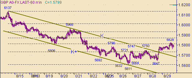 K на рис. 2 и 3 пробита. Сейчас формируется коррекция от снижения курса 1.6137(14/08/03)-1.5611(26/08/03) − см. на рис. 3. Сегодня рынок тестирует второй уровень Фибоначии. На сегодня важные уровни: поддержка − 1.5750; сопротивления − 1.5815. Закрепление курса выше 1.5810 переводит интерес участников рынка в диапазон 1.5800-1.5965. Опускание курса ниже 1.5750 будет стимулировать фунт/доллар к тестированию линии K на рис. 3.Торговые тактики. Работать по направлению выхода из интервала 1.5750-1.5815. Выходом из интервала будем считать закрытие часа выше или ниже уровня. Для покупок цель − 1.5940. Для продаж − линия
