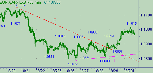 60мин. Продолжается формироваться коррекционное движение от снижения курса во второй ветки в канале Y-Y+ на рис. 1. Началом второй нисходящей ветки считаем 1.1549(25/07/03). Первая ветка 1.1930(16/06/03)-1.1110(16/07/03) составила длину 820п. Равенство длин веток находится на уровне 1.0729. Минимальное значение курса во второй ветки равняется 1.0787, т.е. длина её ровна 762п.Последний торговый день (как и неделя) закрылся на уровне 1.0987, что значительно выше приметного индикативного уровня, равного 1.0930. Восходящее движение от минимума прошлой недели, равного 1.0787(26/08/03), проходит следующим образом: первая