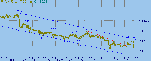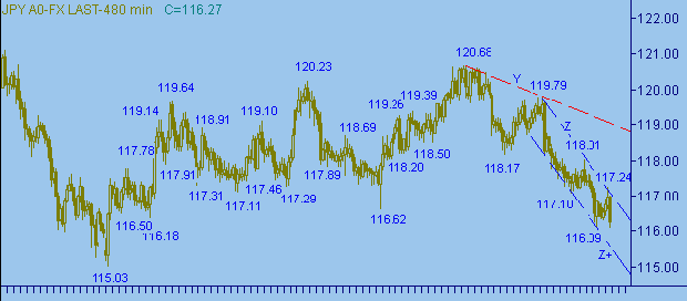 Продолжается нисходящее движение в канале Z-Z+ на рис. 2 и 3. Это движение проходит следующими поддвижениями: первая ветка 119.79-117.10 длиной269п.; вторая ветка − 118.01-116.09 длиной 192п. Предполагаемая третья ветка началась от 117.24. Сегодня рынок пытается опуститься ниже уровня 116.00. Ближайшие целевые области − уровни 115.50 и 115.00. Важные уровни: 116.00 и 117.30.