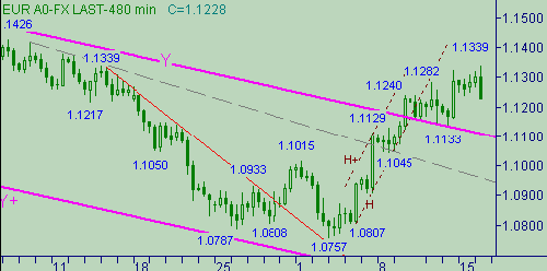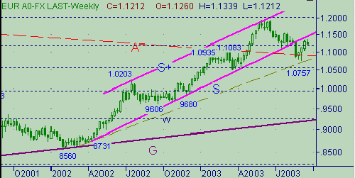 S на рис. 4 можно провести несколькими способами (как варианты: через дневные Low или через цены закрытия дня) и каждый из способов можно считать вполне оправданным. Для примера ранее мы приводили график с периодом неделя на котором графическая кривая евро/доллар уже побывала выше линии S, но то был график в линейном масштабе. На графике в полулогарифмическом масштабе ситуация несколько иная (см. на рис. 4) - рынок только-только тестирует эту линию. А на месячном графике с таким же масштабом евро/доллар сегодняшним максимумом, равным 1.1339, точно коснулись линии S. Вот такие "пироги" на нашем столе ? Следовательно рынок имеет дополнительные степени свободы в определении технических целей. Кстати сегодняшний максимум почти соответствует уровню 50% коррекции от снижения курса в канале Y-Y+ на рис. 1 (движение 1.1930(17/06/03)-1.0757(4/09/03)).На рис. 3 видим, что евро/доллар пытаются опуститься ниже линии
