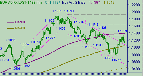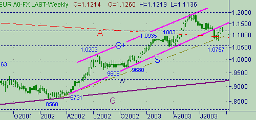 down-движения 1.1339(16/09/03)-1.1136(17/09/03) длиной 203п. Т.е. тогда можно рассматривать в качестве целевой области интервал 1.1000-1.1050.Если охарактеризовать текущую ситуацию, то её можно назвать как "между двух линий" - между линией