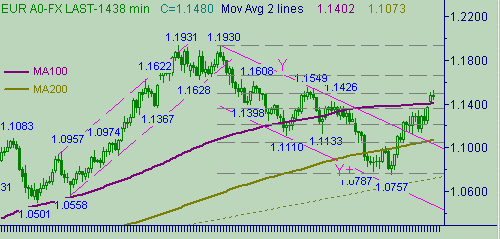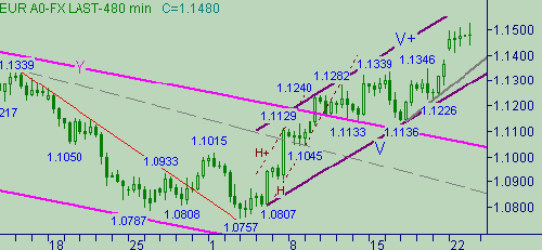 приведены графики с периодами день, 480мин., 60мин.Сегодня евро/доллар пытаются пробиться выше 1.1500 − см. на рис. 3. Максимум текущего дня равен 1.1526. Линией