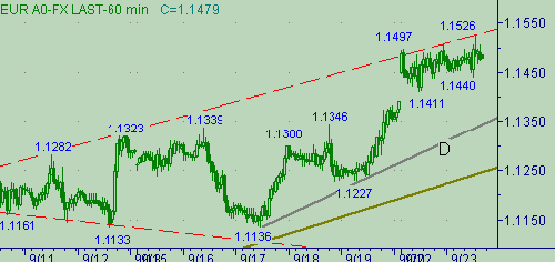 D мы обозначили движение во второй восходящей ветки в канале V-V+. Вчерашнее рассмотрение движения в канале V-V+ остается актуальным. Рост курса в канале V-V+ формируется следующим образом: первая ветка 1.0807(4/09/03)-1.1339(16/09/03) длиной 532п.; вторая ветка началась от 1.1136(17/09/03). Структура второй ветки: первое поддвижение 1.1136-1.1346 длиной 210п.; второе поддвижение 1.1238-1.1497 длиной 259п. Текущую ситуацию по-прежнему рассматриваем как процесс формирования коррекции от второго поддвижения во второй ветки в канале V-V+ на рис. 2. Ожидаем формирование третьего восходящего локального тренда в росте курса вдоль линии D на рис. 3. Поэтому как для открытых так и для вновь открываемых позиций на покупку стоп-лосс определять ниже линии D на рис. 3. Текущее положение линии D соответствует значению курса равного 1.1342. Напомним, что максимум в первом up-движении вдоль линии D равен 1.1346, а в движении в канале V-V+ соответствующий максимум равен 1.1339.Торговые тактики. В случае подхода курса к уровню 1.1370 открывать позиции на покупку, стоп-лосс − ниже линии