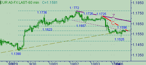 60мин.Последняя неделя имеет "белую" свечу. Но цену закрытия недели можем считать нейтральное по отношению к быкам и медведям. Сегодняшний минимум равен 1.1525, что почти соответствует окончанию движения в третьей восходящей ветки движения с началом от 1.0757(3/09/03): первая ветка − 1.0757(3/098/03)-1.0872(3/09/03) длиной 115п.; вторая ветка − 1.0807(4/09/03)-1.1339(16/09/03) длиной 532п.; третья − 1.1136(17/09/03)-1.1534(25/09/03) длиной 398п.; четвертая − 1.1390(29/09/03)-1.1772(2/10/03) длиной 381п.