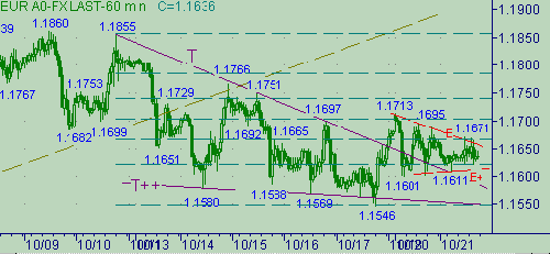 T-T++ (см. на рис 3) и после этого организовали другой треугольник - треугольник E-E+ на рис. 3, но уже размером поменьше. Первое up-движение в треугольнике E-E+ составило 112п. (1.1601-1.1695), а первое down-движение − 112п. (1.1713-1.1601). В общем, треугольник достаточно серьезный. В случае выхода через сторону E, евро/доллар повторят обозначенную ранее цель вблизи области 1.1760: равенство длин восходящих движений - ветка 1.1546-1.1713 и ветка с началом от 1.1601; цель на отработку треугольника T-T+ находится на уровне 1.1745. В случае выхода ниже 1.1600 − берегись уровень 1.1550, т.к. цель от треугольника E-E+ в этом случае получается на уровне 1.1500. И тогда от треугольника T-T++ мы получим "Собаку Баскервиллей", т.к. час закрывался выше последнего максимума (равен 1.1697(16/10/03)) в этом треугольнике, но в случае опускания курса ниже 1.1550 потенция треугольника T-T++ не будет отработана. Отметим, что уровень 1.1550 достаточно технически защищенный и его можно использовать для открытия дополнительных позиций на покупку. Поэтому в случае продаж будьте аккуратны и выполняйте стоп-лоссы.Торговые тактики. Для постановки позиций опираться на формацию треугольника