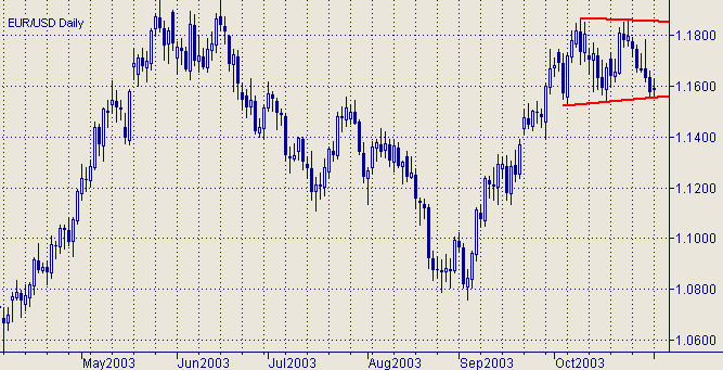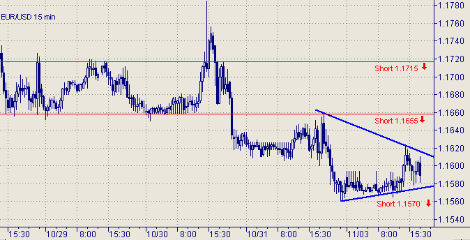 Опираясь на картину дневного графика, мы можем утверждать, что шорт в текущих условиях предпочтительнее других альтернатив, так как фигура "двойная вершина" еще сохраняет свой потенциал. Возможные точки входа в рынок с короткой позицией обозначены на краткосрочном, 15-минутном графике. Однако два-три неудачных дня тестирования нижней границы диапазона (на дневном графике), которая к тому же выступает линий основания для головы и плеч, вполне может изменить техническую картину на бычью, и тогда очертания "восходящего треугольника" проявятся более отчетливо. Отсюда, мы можем сделать вывод, что ближайшие два-три дня представляют собой решающий период, с точки зрения, определения среднесрочного направления динамики рынка.