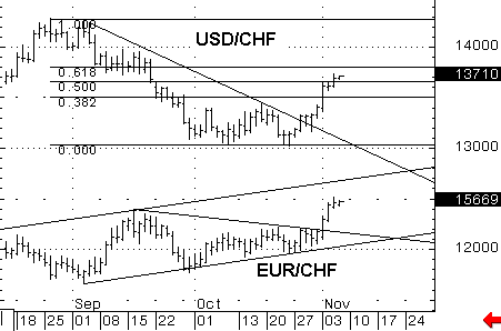 График щвейцарского франка против доллара и евро на рынке форекс.