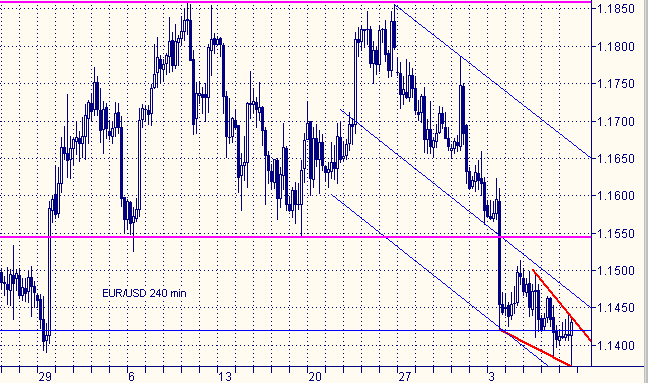 В результате долгого и упорного тестирования нижней стороны рынка накопилось много шортов, частичный процесс ликвидации которых мы наблюдаем сейчас. Не исключено, что особую активность сейчас на спот-рынке проявляют участники рынка опционов, защищающие свои интересы. Кому-то могло просто показаться, что 4 фигуры падения за две недели - это много. Как бы там ни было, на четырехчасовом графике можно различить, правда, не с первого взгляда, очертания вниз направленного симметричного треугольника (бычьего клина), а на краткосрочном - шип - разворотную модель. Все это создает риски повышения евро на следующей неделе. В этой ситуации рекомендуется закрыть/сократить короткие позиции.