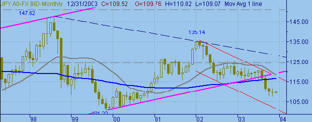 Доллар/йена находятся в стадии затянувшегося коррекционного движения от снижения курса 117.68(15/09/03)-107.81(29/10/03). Рассматривать постановку позиций считаем возможным, в случае закрытия дня выше 110.00. Целевые области для покупок − 111.50, 112.70.