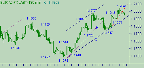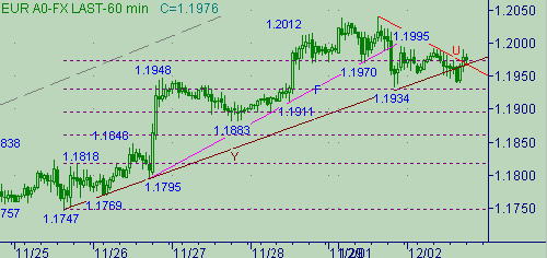 Сегодня рынок закрыл час ниже линии Y на рис. 3. Рост курса вдоль этой линии составил 294п. (1.1747(25/11/03)-1.2041(1/12/03)). Сейчас формируется коррекция от этого движения. На сегодня важные уровни поддержки совпадают с уровнями Фибоначчи от