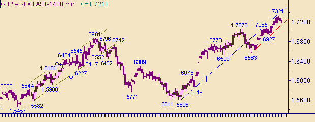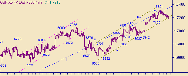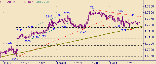 K" на рис. 2. Текущее положение линии K соответствует значению курса 1.7152. Сейчас рынок находится между линиями K (на рис. 2) и P (на рис. 3). Можно считать, что в нисходящем канале P-P+ коррекция от роста курса 1.6942(26/11/03)-1.7321(3/12/03) уже сформировалась. Поэтому у рынка нет выбора и осталось два варианта: или формировать очередную восходящую ветку в канале K-K+ или формировать коррекционную формацию от роста курса 1.6563(7/11/03)-1.7321(3/12/03). В случае формирования коррекции первую цель для нисходящего движения рассматриваем на 1.7085, а следующие целевые уровни − 1.7035 и 1.6945. Целевые уровни в случае роста курса фунта: 1.7465 и 1.7660.Торговые тактики. В случае роста курса до 1.7290 открывать позиции на продажу, стоп-лосс/переворот − 1.7351, цель − 1.7035. В случае переворота (открытия позиции на покупку) на 1.7351, стоп-лосс − 1.7290, цель − 1.7460.