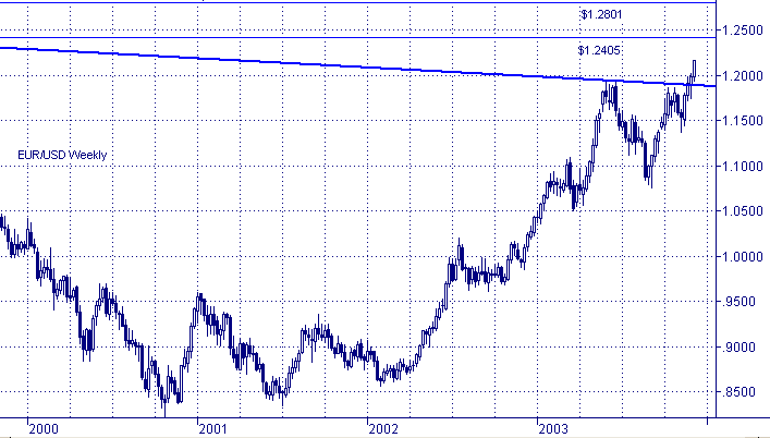 Евро блестяще закрывает текущую неделю, что позволяет предполагать наличие предпосылок для предновогоднего ралли. Этому периоду вообще свойственны моменты бурного роста на многих рынках, так как в связи с окончанием налогового периода многие фонды закрывают свои позиции, неплохо разогрев перед этим рынок, на котором работают. Как видно на недельном графике, евро вторую неделю подряд решительно закрывает выше линии даун-тренда, проведенную через максимумы октября 98 и июня-июля нынешнего года. Возможные цели обозначены на приведенном ниже графике - это так называемые "исторические максимумы": $ 1.2405 - максимум октября 98, $ 1.2801 - максимумы августа и ноября 96 и октября 94. В обоих случаях использовался график т.н. "синтетического евро". Кроме того, на графике не обозначена т.н. психологическая цель - отметка $ 1.25. Помимо того, что это big figure, это еще и цель, заявленная в прогнозах многих ведущих аналитиков валютного рынка.