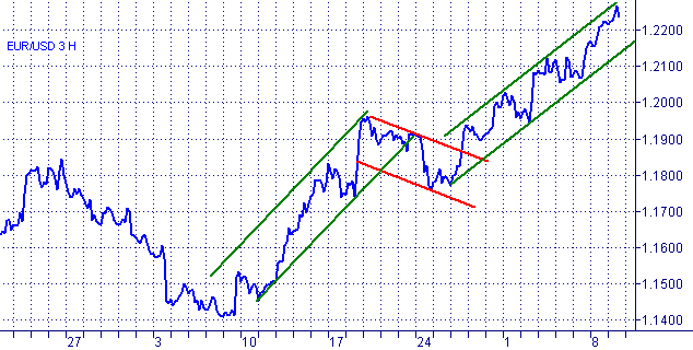 Евро достиг цели, полагаясь на фигуру "отмеренный ход" (см. трехчасовой график по закрытию). Пятнадцатиминутный график показывает варианты возможной коррекции. В нынешней ситуации рекомендуется сократить длинные позиции. Открывать шорты в условиях бурного развития восходящей тенденции - очень рисковое занятие. В этом случае рекомендуется установить близкий стоп.