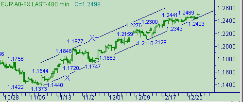 Напомним ещё раз структуру движения в канале X-X+: первая ветка − 1.1373(7/11/03)-1.1977(19/11/03) длина 604п.; вторая ветка − 1.1747(25/11/03)-1.2276(9/12/03) длина 529п.; третья ветка началась от 1.2129. Целевые области для третьей ветки − 1.2660 и 1.2735.