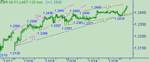 Продолжается рост курса евро против доллара в пределах канала U-U+ на рис. 3. Движение в этом канале проходит следующим образом: первая ветка − 1.2343-1.2450 длиной 107п.; вторая ветка − 1.2377-1.2469 длиной 92п.; третья ветка началась от 1.2418, целевой расчетной областью для неё рассматриваем интервал 1.2500-1.2525. Если восходящее движение в пределах клина O-O+ на рис. 3 можно рассматривать как импульсное, то изменение курса в канале U-U+ как импульс мы не рассматриваем, т.к. пока это больше похоже на составную часть коррекционной формации от up-тренда 1.2129(15/12/03)-1.2441(19/12/03) (клин O_O+ на рис. 3). Таким образом, уровень 1.2525 рассматриваем как важный уровень - выход курса выше этого значения обозначит нам новый импульс на рост курса евро.
