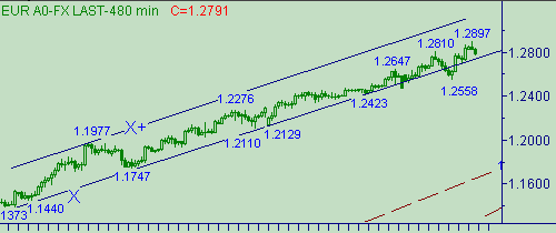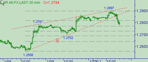 Сегодня евро/доллар успешно преодолели уровень 1.2850, затем почти коснулись 1.2900 (сегодняшний максимум равен 1.2897). Сейчас формируется коррекционная формация от роста курса вдоль линии E на рис. 3. На графиках с периодом 240мин. рынок в очередной раз нарисовал свечную фигуру "медвежье поглощение". Отметим, что предыдущие две подобные фигуры рынок честно и уверенно отрабатывал.