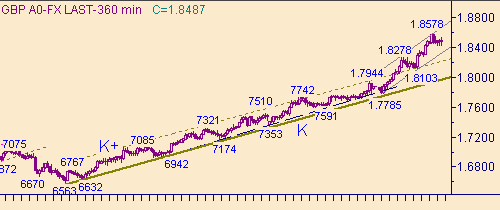 Локальная коррекция от второго восходящего движения в пределах канала S-S+ на рис. 3 продолжается. В рамках этой коррекционной формации фунт/доллар сформировали первую нисходящую ветку 1.8578-1.8421, состоящую из двух равновеликих нисходящих локальных down-движений: 1.8578-1.8451 и 1.8548-1.8421. Сама первая нисходящая ветка имеет длину 157п. Сейчас рынок определяется со своими дальнейшими планами. Вариантов всего два. Первый - сейчас формируется X волна, после которой фунт/доллар продолжат нисходящее коррекционное движение. При рассмотрении первого варианта, целевая область располагается на уровне 1.8400. В этом случае у рынка появляется соблазн протестировать линию S на рис. 3 − текущее положение линии S на рис. 3 соответствует значению курса 1.8327. Второй вариант − рынок пытается обозначить новое импульсное восходящее движение на рост курса фунта, чему способствует тот факт, что сегодня с 13:00мск. по 15:00мск. фунт/доллар сформировали три локальных восходящих движения по структуре очень подходящих под определение последовательность волн 1-2. Сегодняшним максимумом, равным 1.8536, рассматриваемая пара уже одну потенциальную пятиволновку отработала.