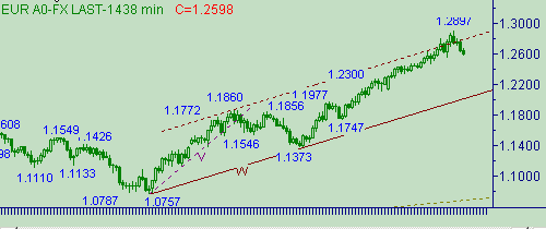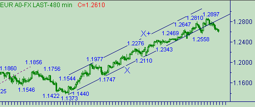 Вчерашний день внес небольшую путаницу в последовательность открытия и закрытия позиций. Ожидаемый максимум на уровне 1.2740 не был достигнут (соответствует вчерашнему значению 1.2731 в 20:00 мск.) поэтому открытие долгосрочных продаж, к сожалению не состоялось. С другой стороны краткосрочные позиции на продажу были закрыты или по стоп-лоссу (на уровне открытия позиции) или по достижению цели на 1.2615.