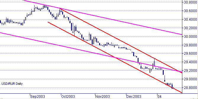 Курс доллара США по отношению к рублю на внутреннем рынке в понедельник практически не изменился по сравнению с пятницей - RUR 28.78. Торги были тихими из-за праздников в США, а также наличия поддержки Банка России, который выставил свои биды ниже отметки RUR28.8 Небольшое количество мелких оферов, скопившихся на бирже с утра, Банк России удовлетворил вечером всего несколькими крупными лотами. Общий объем торгов на ММВБ составил сегодня $260.477 млн., из которых $185.188 млн. пришлось на ЕТС с расчетами "завтра" и $75.289 - на дневные торги с расчетами "завтра". Аналитики оценивают нисходящую тенденцию по доллар/рублю как незыблемую. Приближение периода уплаты НДС может послужить очередным поводом для медвежьей игры, хотя денег на денежном рынке для уплаты налогов предостаточно, о чем указывают крайне низкие ставки МБК. Технически, доллар тестирует линию нового даун-канала и имеет возможность для отскока наверх. Однако изменение угла нисходящей тенденции в долгосрочном плане ничего хорошего американской валюте не сулит. Поводом для краткосрочной восходящей коррекции доллара может послужить рост его курса на международном валютном рынке. Так, неделю назад курс евро/доллара составлял $ 1.2900, а сегодня он опускался до $ 1.2330, и это, как уверяют многие специалист, далеко не предел.