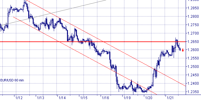 Евро/доллар сформировал шип на часовом графике с максимумом в районе отметки $ 1.2670. Фигура говорит о развороте восходящей краткосрочной тенденции и начале нисходящей. После прохождения зоны консолидации $1.2600/1.2550 движение вниз может ускориться. Часовые осциляторы показывают сильную медвежью дивергенцию, а медленный стохастик даже подал сигнал к продаже. Рекомендуется шорт с текущих уровней, стоп − $ 1.2675. Цель − $1.2100.