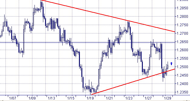 Евро/доллар консолидируется внутри симметричного треугольника − как правило, фигуры продолжения тенденции. Параметры фигуры представлены на трехчасовом графике ниже. У быков есть шанс подняться до отметки $ 1.2650, а в случае развития успеха − даже протестировать верхнюю границу фигуры, которая сейчас проходит в районе отметки $ 1.2710. Первое сопротивление расположено на уровне $ 1.2560. При прорыве из треугольника цены проходят, как правило, расстояние, равное высоте фигуры.