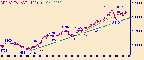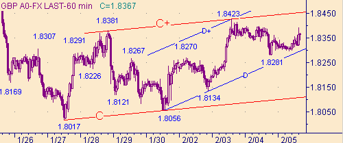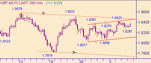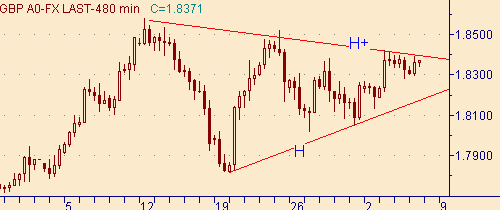 В случай выхода курса ниже 1.8270 у рынка появляются перспективы протестировать линию H на рис. 4, а тем самым попробовать на прочность модель "симметричный треугольник" для коррекционного движения от роста курса 1.6563(7/11/03)-1.8578(12/01/04). Текущее положение линии H на рис. 4 соответствует значению курса 1.8173.