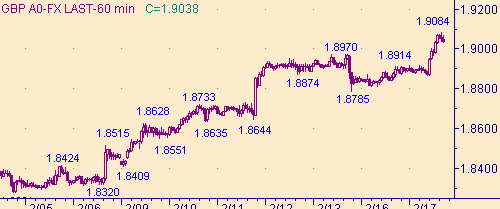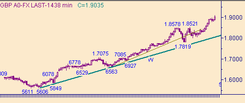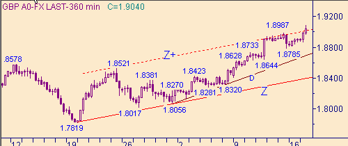Восходящее движение вдоль линии D на рис. 2 продолжается. Третья восходящая ветка в этом движении началась от 1.8320. Сейчас в этой ветки формируется уже третья up-ветка: первая ветка − 1.8320(6/02/04)-1.8733(10/02/04) длина 413п.; вторая − 1.8644(11/021/03)-1.8987(13/02/04) длина 326п.; третья ветка началась от 1.8785(13/02/04) − см. на рис. 3.