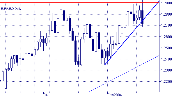 Медведи берут ситуацию под свой контроль. Положение быков усугубилось сегодня тем, что после прорыва уровня абсолютных максимумов на 1.2898 многие краткосрочные игроки стали открывать лонги, которые в ходе вечернего движения лишь усугубили падение европейской валюты, превратив его в обвал. Безусловно, важным представляется сегодняшнее закрытие свечи. Прорыв самой крутой линии аптренда (обозначена на графике) станет первым серьезным сигналом к тому, что продавцам удается формирование разворотной модели "двойная вершина". Ее основание обозначено на линейном графике. Цель определяется по высоте фигуры.