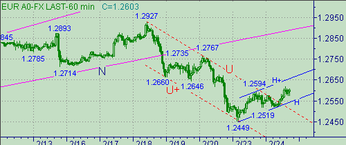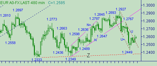 На рис. 3 обозначился восходящий канал U-U+. Сейчас в этом канале формируется вторая восходящая ветка: первая ветка − 1.2449-1.2594 длина 145п.; вторая ветка началась от 1.2524 и в случае равенства длин веток, ожидаем цель для второй на уровне 1.2669. Текущей нашей задачей считаем пытаться попасть в движение во второй ветки.
