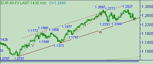 Последний торговые день не смог закрыть свою свечу ниже линии W на рис. 1. Текущее положение линии W на рис. 1 соответствует значению курса 1.2435.
