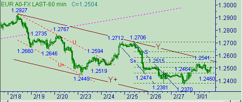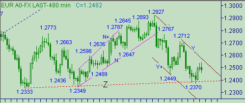 Евро/доллар остаются в пределах канала Y-Y+ на рис. 2. Текущее положение линии Y на рис. 2 соответствует значению курса 1.2562. Технически важную область сопротивления рассматриваем на уровне 1.2655. В то время пока курс евро/доллар будут располагаться на графике цен ниже обозначенного уровня сопротивления позиции "медведей" являются предпочтительнее. Целевую область для продаж рассматриваем в интервале цен 1.2200-1.2275.