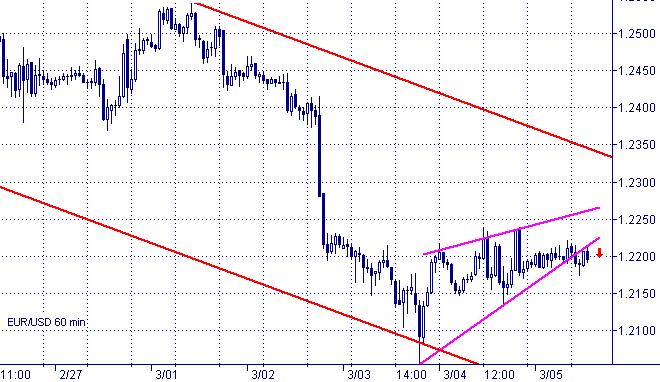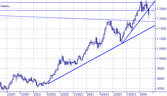 Евро/доллар. Среднесрочный тренд сменился с горизонтального на нисходящий, благодаря модели перелома "двойная вершина", долгосрочный тренд станет нисходящим при пробитии линии долгосрочного аптренда на недельном графике в районе $ 1.16. Краткосрочные графики сформировали "медвежий клин" - вверхнаправленный сходящийся треугольник, который, как привило, предупреждает о дальнейшем движении цен вниз. Более того, цены уже пробили нижнюю границу фигуры. Итак, продолжаем ждать евро в районе 1.1950/30.
