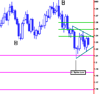 Комментарий. Консолидация в пределах треугольника говорит о том, что пара может продолжить движение в каком-либо ином направлении. Мы считаем, что евро ожидает прорыв вверх, однако сегодня это будет сделать трудно. Пробитие 1.2450 или закрытие дня выше 1.2400 укажет на завершение нисходящего движения.