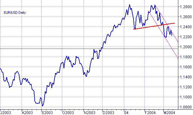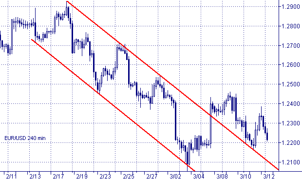 Быкам не удалось сформировать двойное дно, эта затея закончилась образованием шипа с максимумом на 1.2385. Поддержка находится на уровне сначала второго, а потом и первого дна (минимума 2004 г). Их прорыв ускорит падение. На дневном графике цены оттолкнулись от линии основания двойной вершины и направляются вниз в рамках канала.
