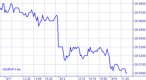 Средневзвешенный курс доллара на завтра на единой торговой сессии (ЕТС) ММВБ к настоящему моменту снизился на 0.6 копейки по сравнению с уровнем закрытия предыдущего торгового дня и составил RUR 28.5064. Объемы пока остаются весьма скудными - $6.945 млн.