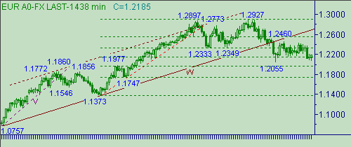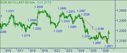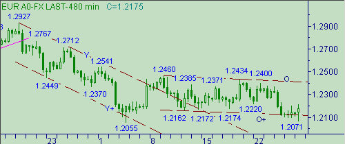 Евро/доллар не долго баловали нас движениями похожими под классическое определение тренда и канала, оставив нам на раздумье проблему понимания последнего нисходящего движения от вчерашнего максимума 1.2198 до сегодняшнего минимума 1.2071.