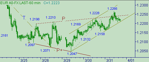 Локальное восходящее движение продолжается. Сегодняшний максимум, равный 1.2262 соответствует попаданию в целевую область для этого движения. Структура этого движения: первая ветка 1.2047-1.2169 длина 122п.; вторая − 1.2132-1.2228 длина 104п; третья ветка началась от 1.2158 и имеет целевой интервал 1.2260-1.2280. По структуре роста курса с началом от 1.2047(29/03/04) это движение выглядит законченным. Сейчас формируется коррекционная формация от этого тренда. Первой целевой областью для этой коррекции рассматриваем интервал 1.2160-1.2185. От этой ценовой области можно пытаться рассматривать постановку позиций на покупку в надежде попасть во второе up-движение длиной в 200п. Конечно, рассматривая рост 1.2047(29/03/04)-1.2266(31/03/04) как первое восходящее движение можем ожидать коррекцию от него более глубокую чем 50% (попадание в область 1.2160), но интервал 1.2160-1.2180 технически очень и очень симпатичен.