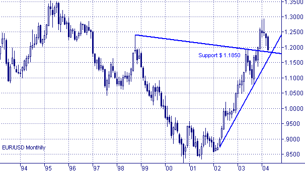 Евро/доллар приближается к очень сильной поддержке на $ 1.1850. Здесь проходит линия даунтренда, построенная по максимумам 98 и 03 г синтетического евро. Ниже расположена другая более сильная поддержка − линия аптренда − на $ 1.1650. Ситуация осложняется тем, что вблизи текущих уровней на дневных графиках находится несколько разворотных максимумов, традиционно являющихся сильной поддержкой. Что касается линейного графика, то это уровни $1.1850 и $1.11815, а на свечном − это $1.1937 и $ 1.1867. Вдобавок ко всему прочему, на $1.1815 находится уровень 23.6 % -ной коррекции действующего долгосрочного тренда, начавшегося в октябре 2000 г. И хотя это не самый сильный уровень из всех уровней Фибоначчи, игнорировать его нельзя из-за долгосрочного характера движения. Таким образом, зона $1.18/$1.19 представляет собой сильнейший бастион, прорыв которого с первого раза нем представляется нереалистичным. Отсюда, мы рекомендуем покупки из этой области со стопом ниже $1.18. Однако, напомним, что цель "двойной вершины" до сих пор не отработана рынком. После коррекции/консолидации не исключено, что движение цен в направлении отметки $1.1730 возобновится.