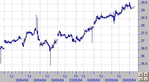 Цены на Light Sweet (июньский контракт) неумолимо приближаются к важнейшему психологическому рубежу в $ 40 за баррель. Как видно на графике, за последние дни цены прошли довольно большой путь, поэтому, скорее всего, упомянуты рубеж будет использоваться как хороший повод для фиксации прибыли. Однако остается все меньше аналитиков, которые не думали бы, что эта отметка будет преодолена. Сегодняшний рост стал следствием действия прежних факторов, сформировавшихся еще в конце апреля, а также данных по запасам нефти и нефтепродуктов в США. Несмотря на то, что по состоянию на 30 апреля в США был зарегистрирован недельный рост запасов нефти и бензина, их запасы по-прежнему неадекватны спросу и поэтому не снимают угрозу образования дефицита автомобильного топлива в предстоящем летнем сезоне. Аналитики указывают на то, что потребление бензина и дизтоплива в стране превышает прошлогодний уровень на 3,8% и составляет 9.1 млн. баррелей в сутки. Дополнительную техническую поддержку нефтяным котировкам сегодня продолжают оказывать как раз фьючерсы на бензин и топочный мазут. Так, бензиновые фьючерсы на NYMEX в системе электронных торгов достигли сегодня новой рекордной отметки с декабря 1984г. - $1.3230 долл./галлон, а фьючерсы на топочный мазут торгуются выше $1/галлон, несмотря на окончание отопительного сезона в северном полушарии.