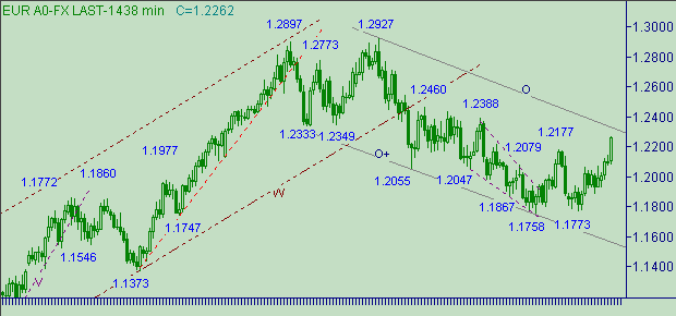 Надежда "медведей" - состояние перекупленности на графиках, а так же близость линии O на рис. 1(текущее положение линии O на рис. 1 соответствует значению курса 1.2323); надежда "быков" - сегодняшний максимум, равный 1.2265 превысил значение 1.2200. Напомним, что в области 1.2200 находится уровень равенства длин следующих восходящих веток: первая ветка - 1.1758(26/04/05)-1.2177(5/05/04); вторая ветка началась от 1.1773(13/05/04) - см. на рис. 2.