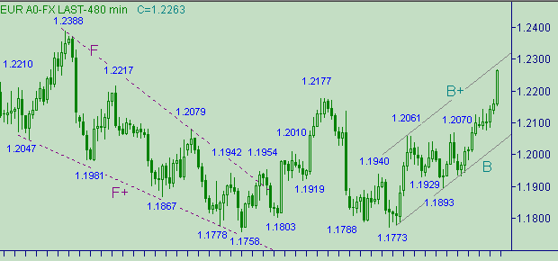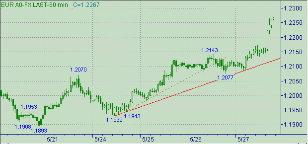 Евро/доллар пытаются закрепиться выше важного уровня, равного 1.2200. Сейчас рассматриваемая пара подошла близка к другому приметному техническому уровню сопротивления, соответствующего интервалу цен 1.2265-1.2285. Например, текущему положению линии B+ на рис. 2 соответствует значение курс а 1.2285, а на уровне 1.2277 находится равенство длин восходящих веток: первая ветка - 1.1943(24/05/04)-1.2143(26/05/04) длина 200п.; вторая ветку началась от 1.2077(26/05/04) - см. на рис. 3.
