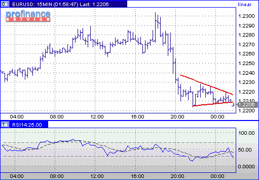 На представленном ниже графике валютной пары евро/доллар мы видим образование треугольника, который в данный момент играет роль классической фигуры продолжения. Если нижняя линия треугольника окажется преодолена, то стоит ожидать продолжения укрепления доллара вплоть до отметки 1.2150. При этом, рассматривая текущую ситуацию, не стоит забывать о сильном уровне поддержке на 1.2200. В данный момент говорить о продолжении нисходящего движения стоит только после пробития этой поддержки. Индикатор RSI подтверждает высказанные предположения, сформировав разворот в сторону зоны перепроданности. Как мы видим, МА расположена выше линии индикатора, и также приобретает нисходящую направленность. Таким образом, целесообразно рассматривать потенциальные цели на 1.2150, но говорить об открытии коротких позиций следует только после пробития фигуры 1.2200.