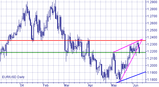 Евро/доллар не смог развить восходящее движение после того, как сработала модель "двойное основание". Как и ожидалось, сопротивление в виде двух разворотных минимумов в области $ 1.2350 с первого раза преодолеть не удалось. А закрытие сегодняшнего дня ниже зоны $1.2180/00 укажет на серьезную слабость быков, тем более, что мы видим формирование "медвежьего клина". Если медведи перехватят инициативу, их целью будет движение к линии двухлетнего аптренда на $ 1.19, а также последующее ее тестирование.