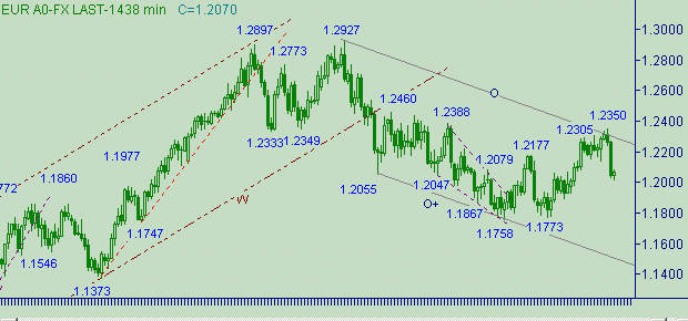 Сегодня нисходящее движение вдоль линии Y на рис. 3 выглядит более "законченным" чем вчера. Т.е. сегодня у рынка больше технических оснований для попыток формирования up-тренда. Например, на графиках с периодом 240мин. формируются сигналы дивергенции на фоне состояния "перепроданности". Но сигналы дивергенции являются только намеками на возможное завершение down-движений, но не основаниями. Поэтому ждем попыток тестирования области 1.1930. Стоп-лосс для позиций на продажу от 1.2090 переносим на 1.2061, цель - 1.1930.