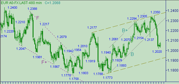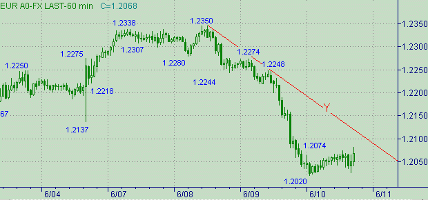 Линию Y на рис. 3 евро/доллар пробили, но дело её живет - нисходящее движение продолжается. Мы скорректировали проведение линии Y на рис. 3, добавив линию E на рис. 3.