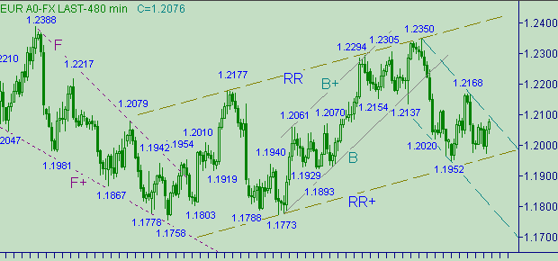 Наши вчерашние подозрения в down-трендвовости рынка оказались не напрасными - сформировался очередной нисходящий локальный тренд величиной 102 п. (1.2075-1.1073 - см. на рис. 3). Любители проводить на графиках прямые линии, лучи и отрезки отвели душу, нарисовав нисходящую линию. В общем, приятно становится от того, что иногда и базовый тех. анализ в дело идет.