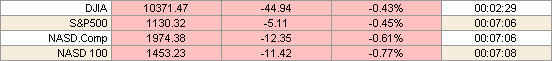 Давление на Dow оказали бумаги Wal-Mart Stores Inc. Крупнейший розничный продавец сообщил о том, что июньский уровень продаж может уступить ожиданиям Wall Street. Акции компании упали на 0.9% до 55.13. Также в новостях слияния/поглощения компаний сообщалось о покупке за 3.5 млрд. долларов компании Chelsea Property Group Inc. Оплатить покупку и стать хозяином согласился Simon Property Group Inc., заявив о том, что таким образом компания пытается расширить свое "присутствие" в Азии. На NYSE акции Chelsea поднялись на 11.5% до 64.93. Simon потерял 1.3%, опустившись до 51.63.